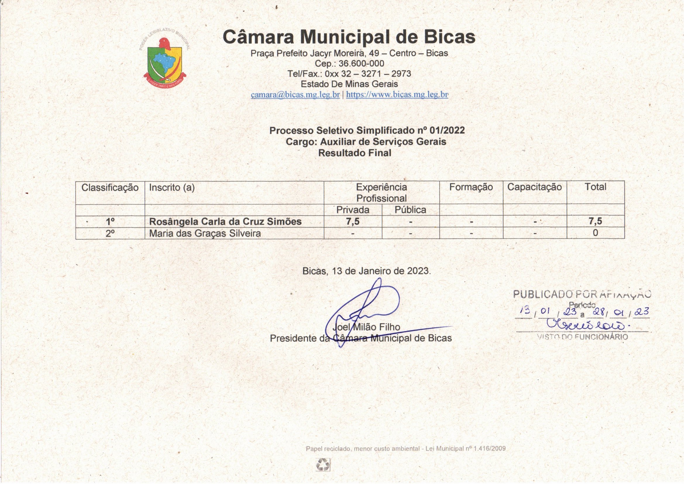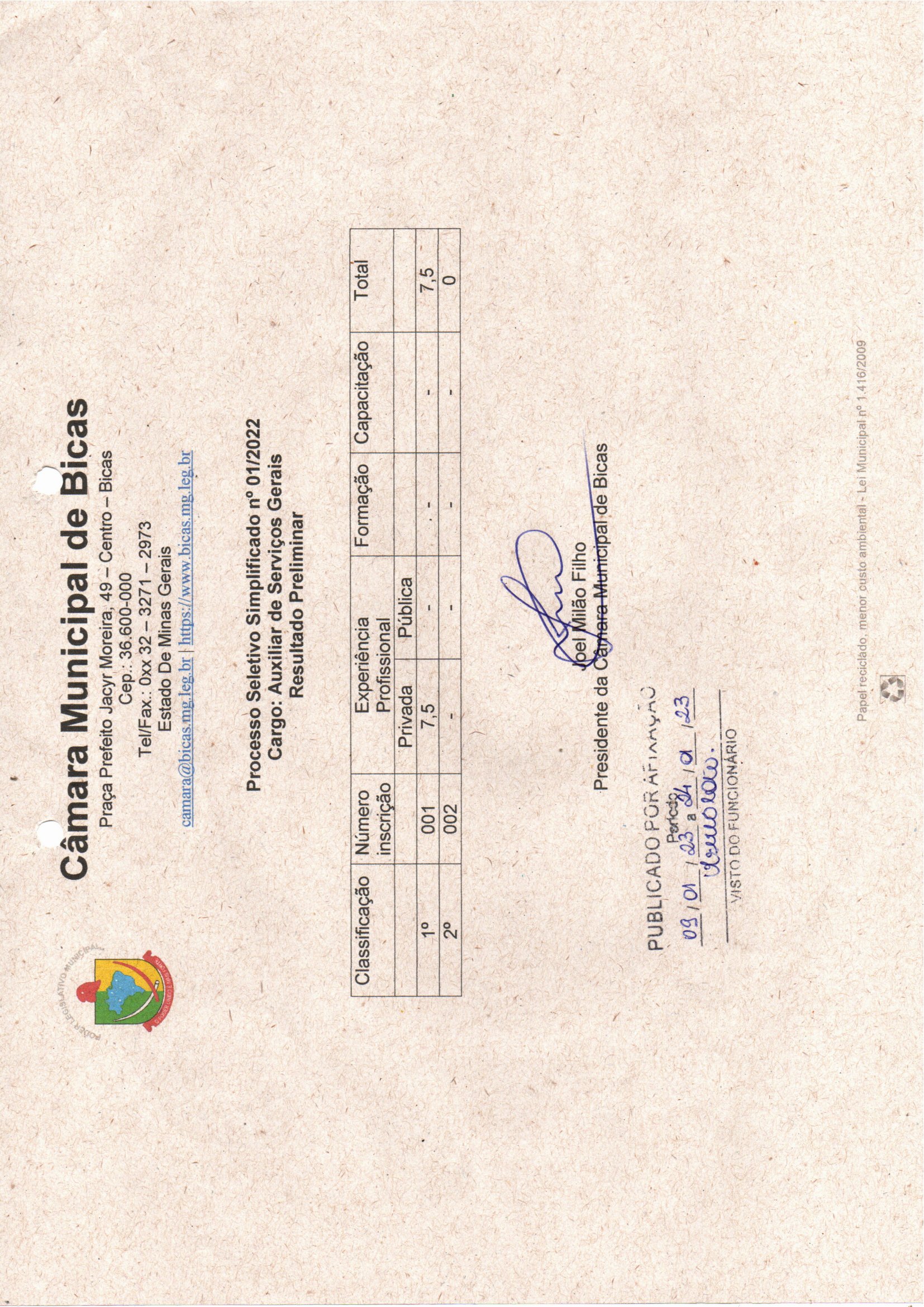 | 09/01/2023 | Resultado preliminar - Processo Seletivo 01 /2022 |